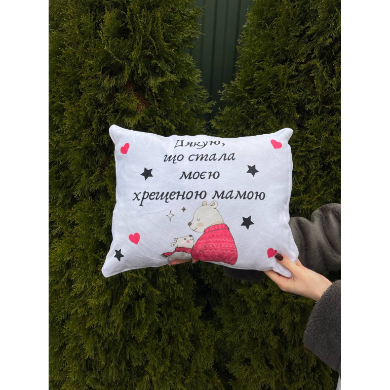 Подушка з принтом плюшева Хрещена мама, біла 35х45 (2430)